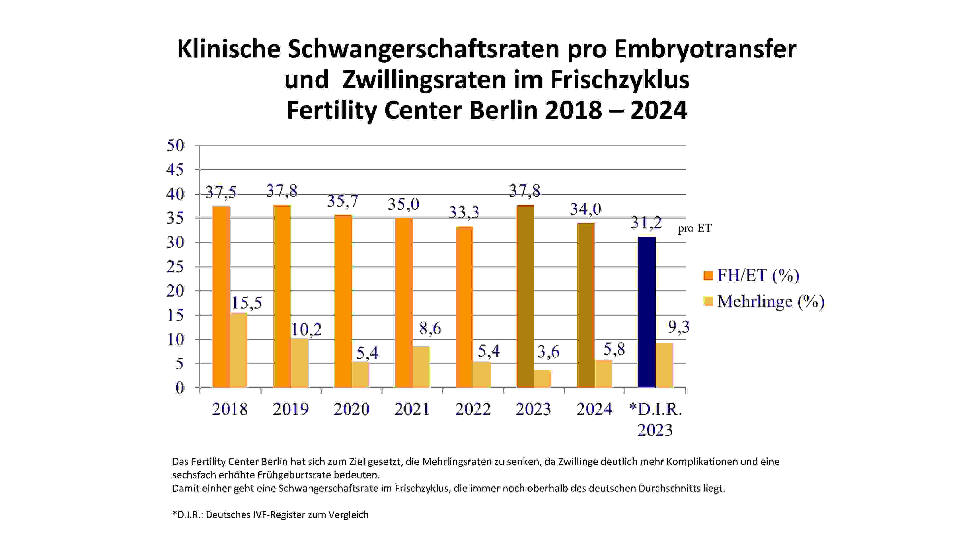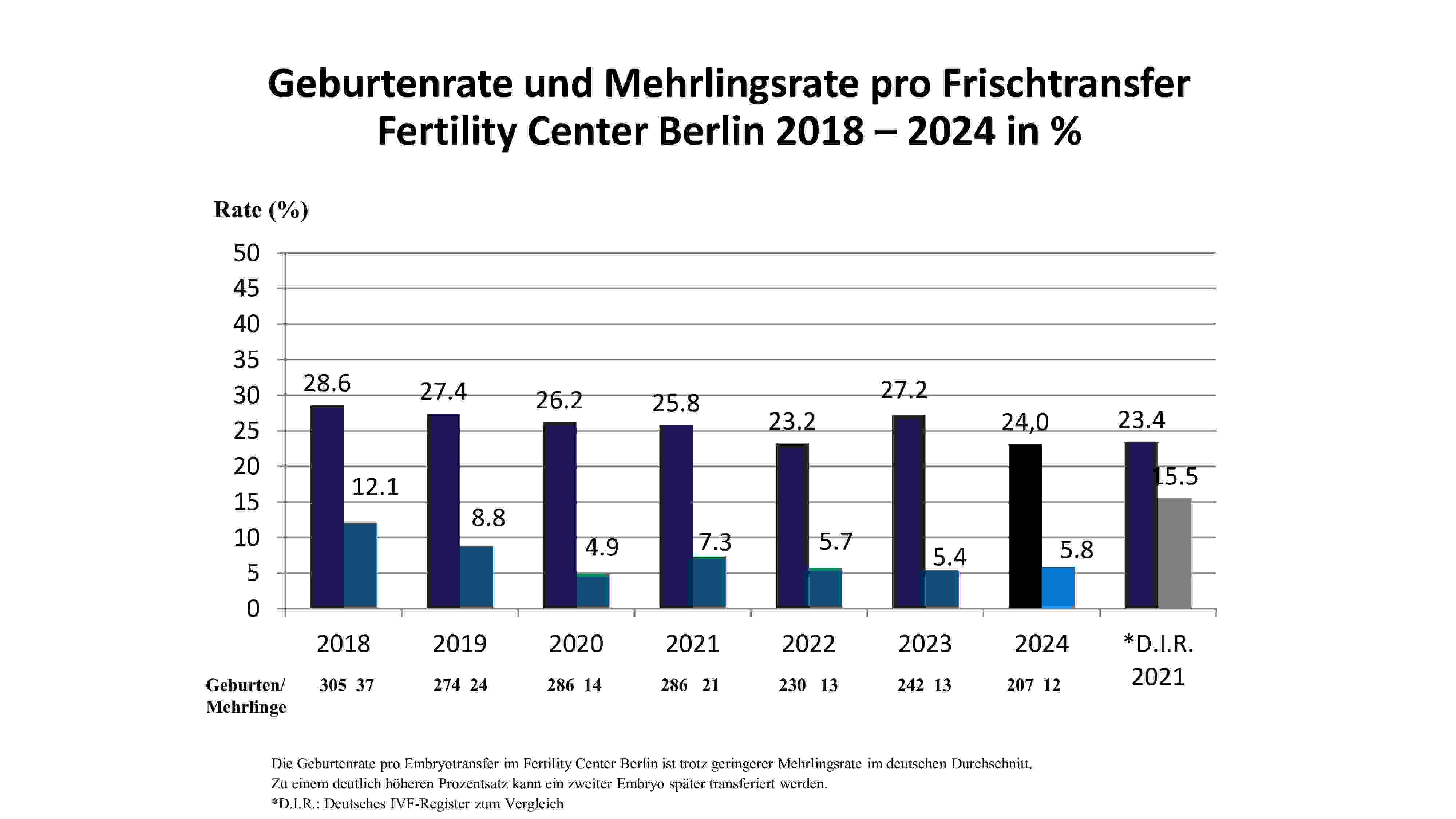 Our pregnancy and birth rates after IVF/ICSI treatment or after a Kryotransfer are well above the national average (German IVF Register). Our success is based on more than 20 years of cooperation between experienced doctors, biologists and the entire medical staff. Our aim is to achieve the best possible therapeutic outcome for our patients, without any burdensome or ineffective additional measures. Please take a look at our statistics.