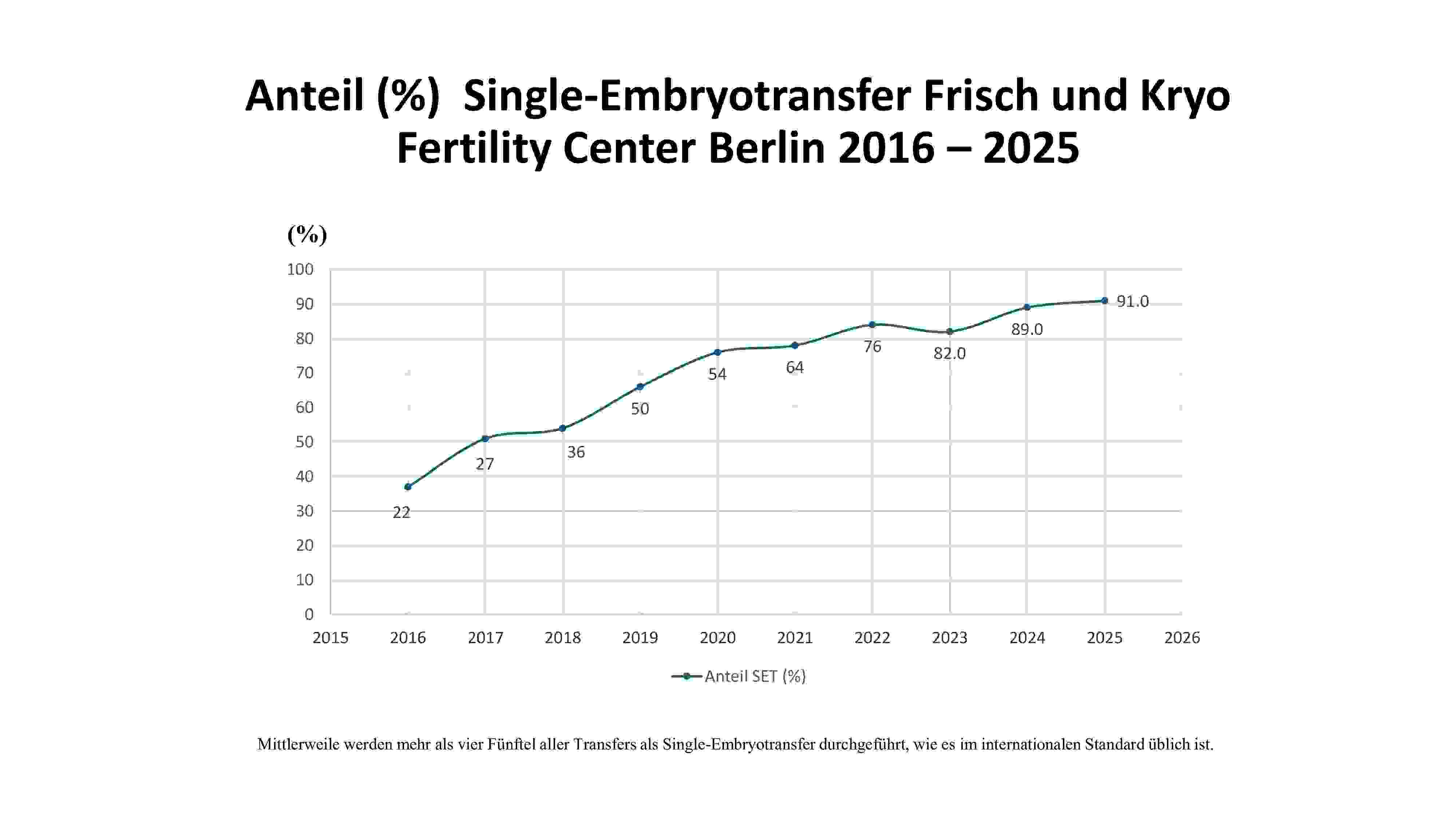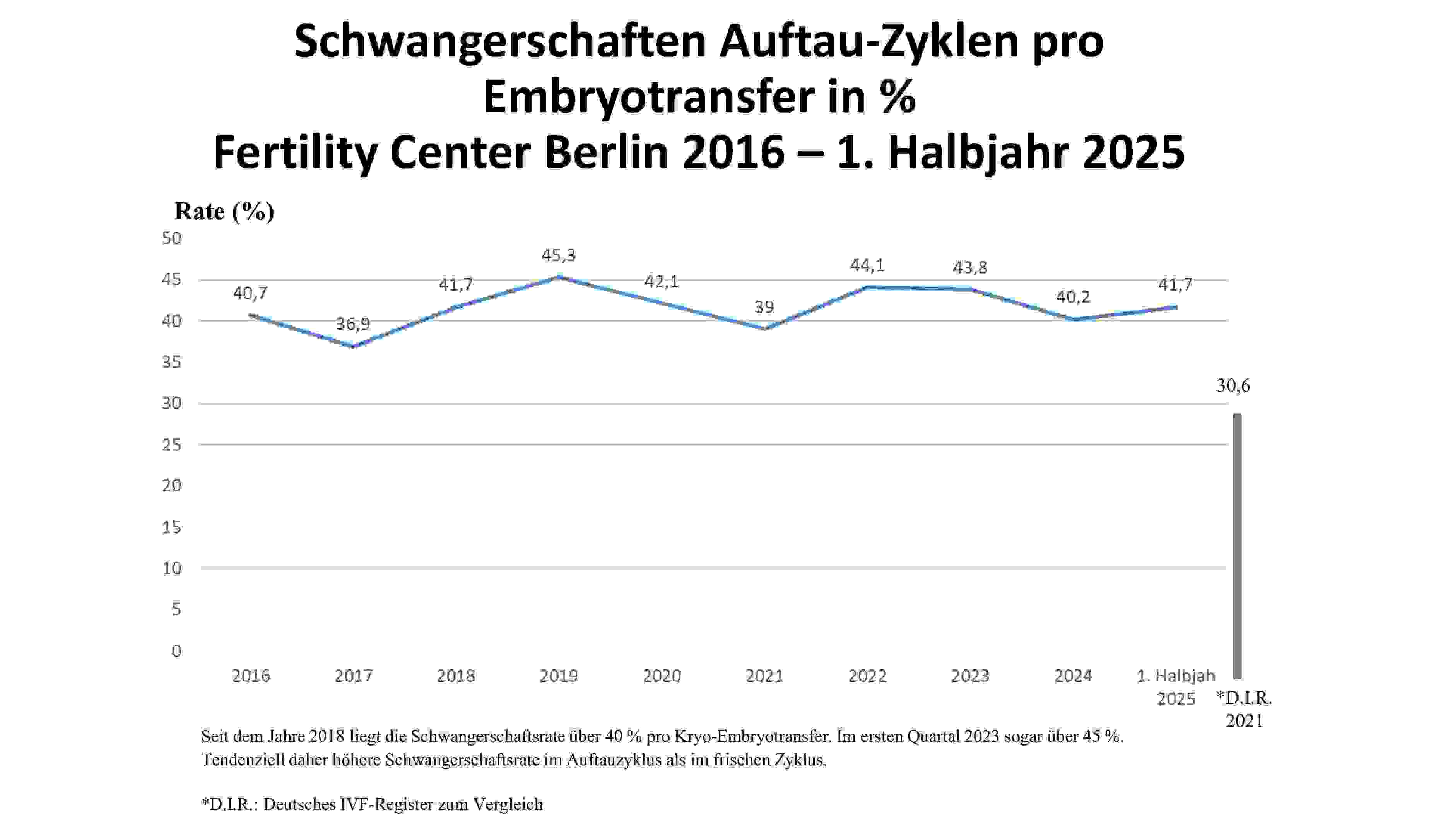 Cryopreserved pronuclear stages or embryos can be transferred back into the uterus in a later cycle without hormone stimulation. However, the statutory health insurance funds do not cover the costs of freezing, subsequent storage or the transfer cycle. The pregnancy rate at Fertility Center Berlin after transfer of thawed oocytes or embryos is just as high as in the fresh transfer cycle.